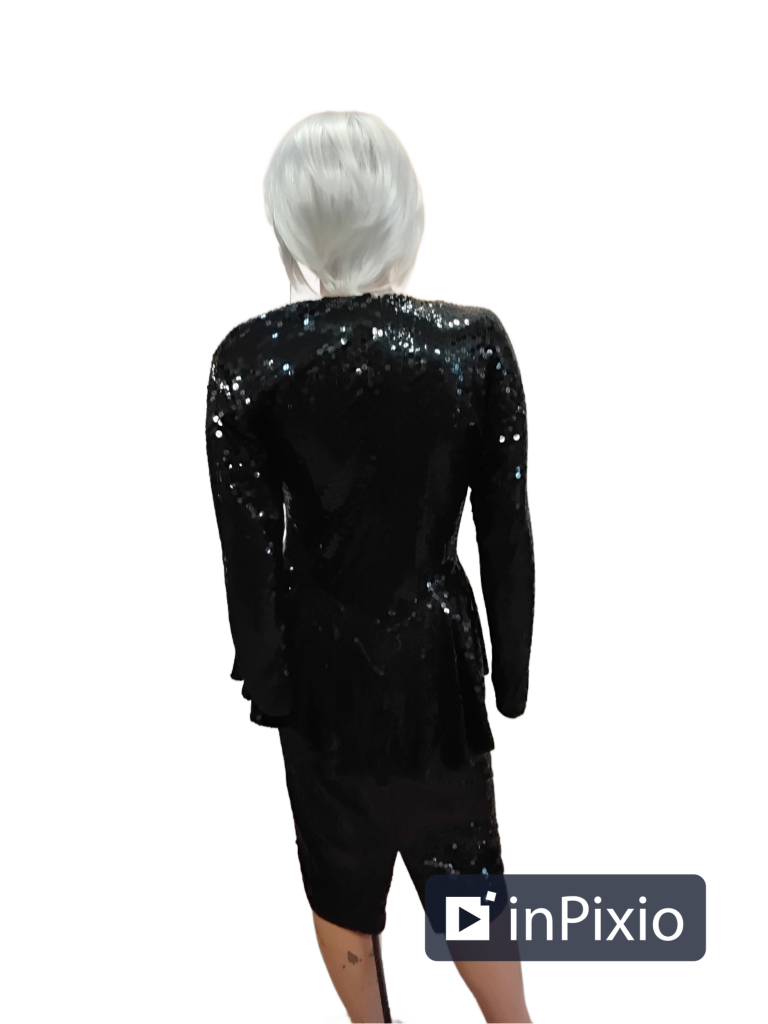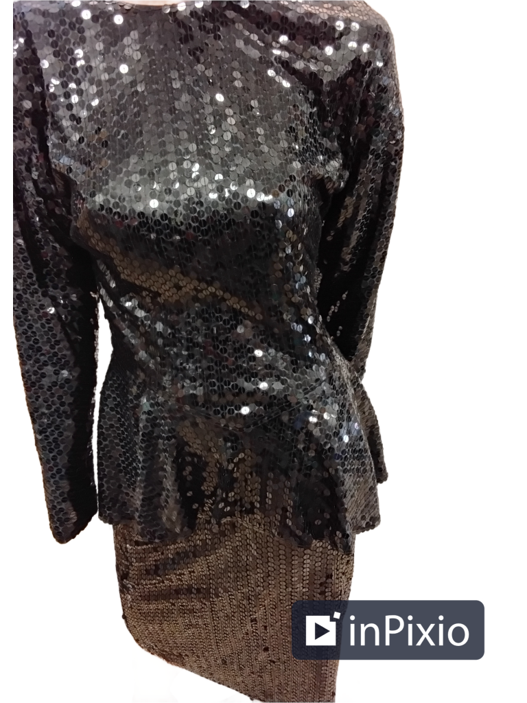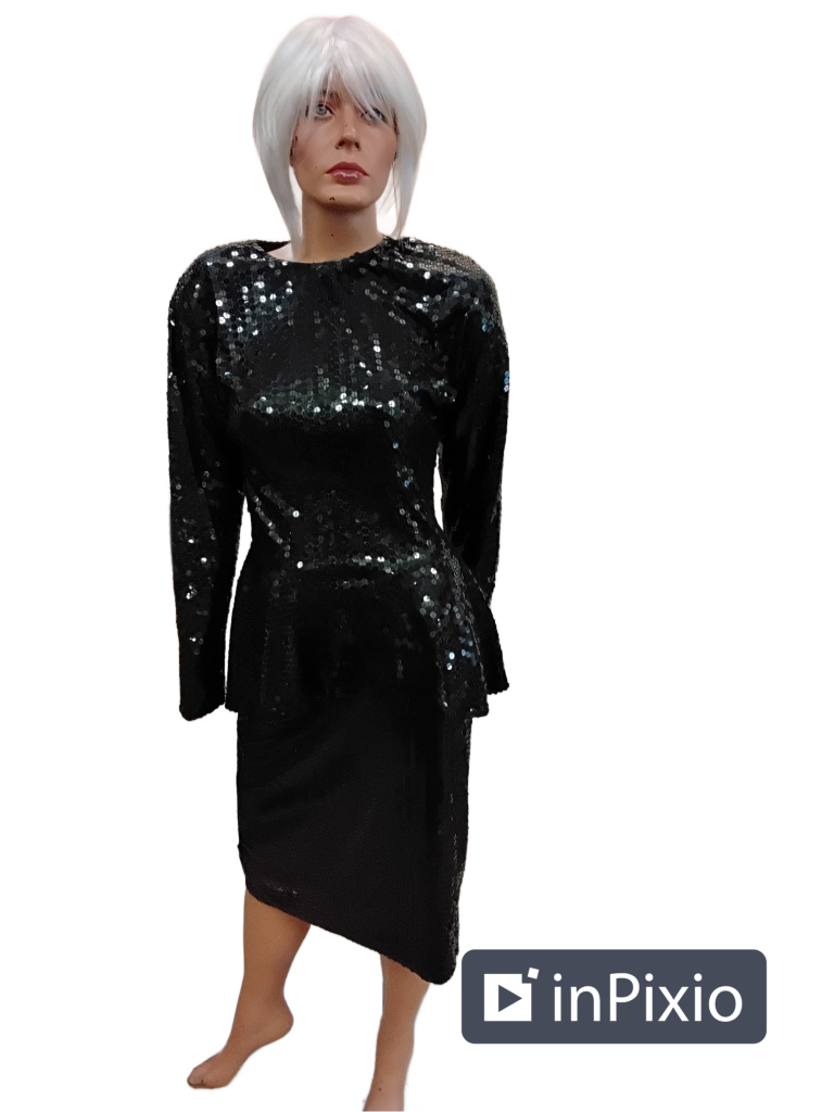 80s Vintage Sequin Black Dress is a form-fitting style dress. The dress has a peplum and has long sleeves and a past the knee length skirt. Skirt has a slit in the back for easier walking.