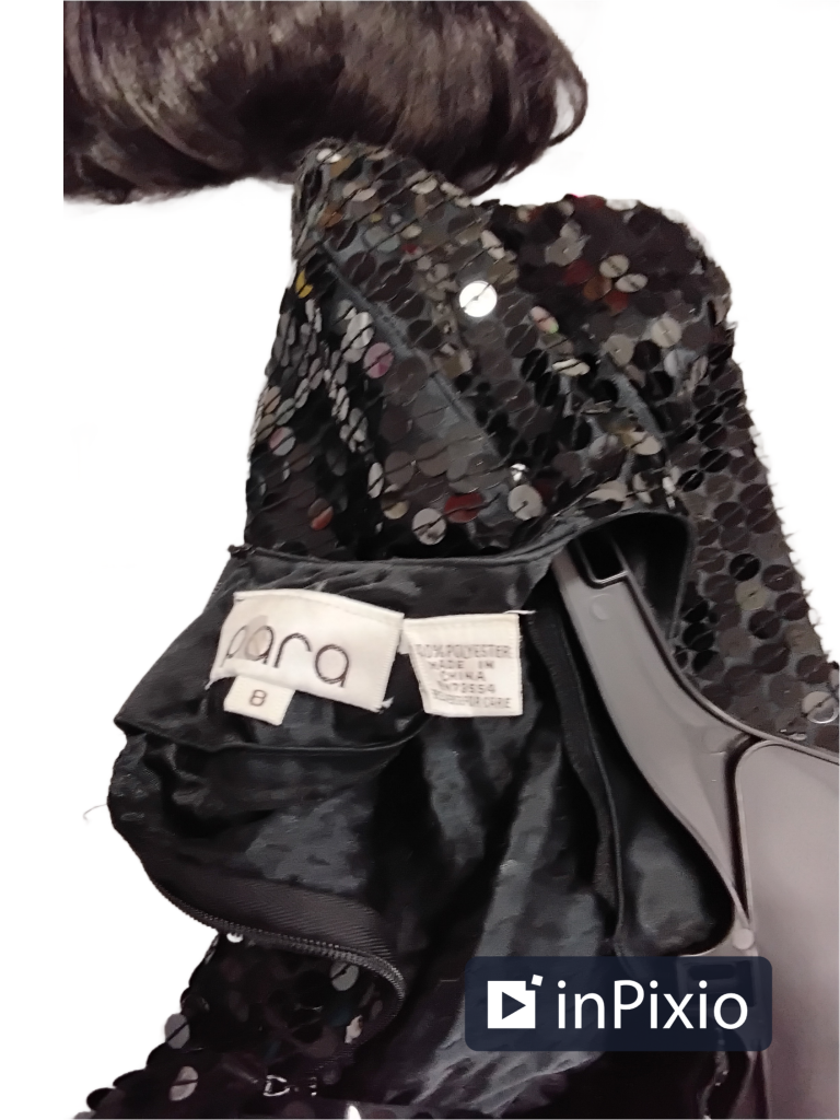 All the black sequins are intack and are in great condition. The dress is polyester and in excellent shape.