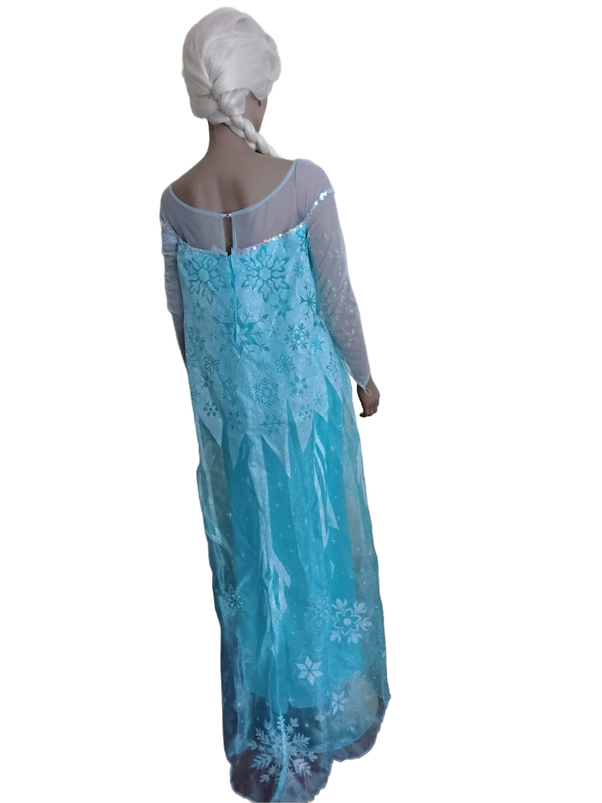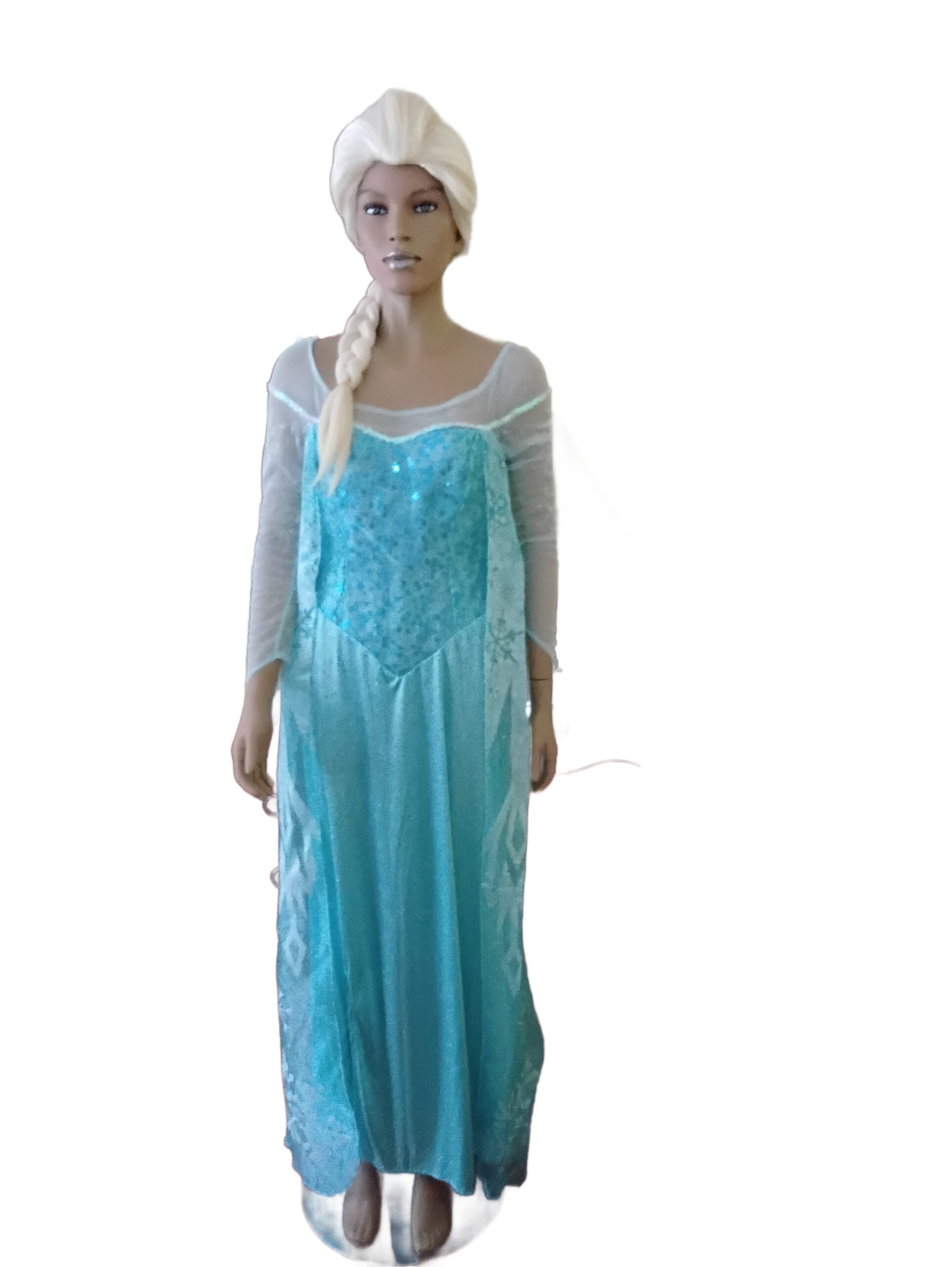 Includes: The “Frozen:” Womens Prestige Elsa Costume includes a blue dress with sheer sleeves and an attached snowflake cape. Elsa wig is available for rental. Please contact me if you would like the wig to be included in your rental shipment. Elsa wig rental is $16.00 additional cost.