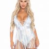 featuring a plunging deep-v neckline, cross over back straps, full back panty, and lots of fringe for an unforgettable look. Comes in size med/lrg