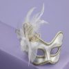 A white masquerade venetian mask accented in gold trim with feathers. Has an attached eyeglass handles for comfort and convenience