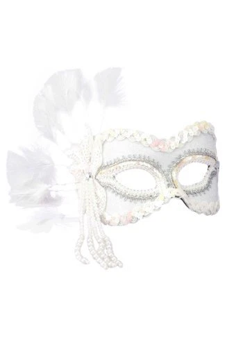 Beautifully crafted, this white with silver accents Venetian Half Mask features iridescent trim for a simple yet elegant look. Feathers adorn the side. The soft, cloth covered headband provides a comfortable and secure fit while giving the wearer the ‘no-fuss’ option of raising or lowering the mask without removing it!