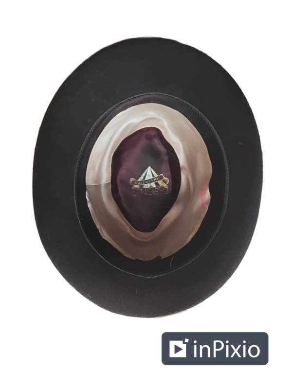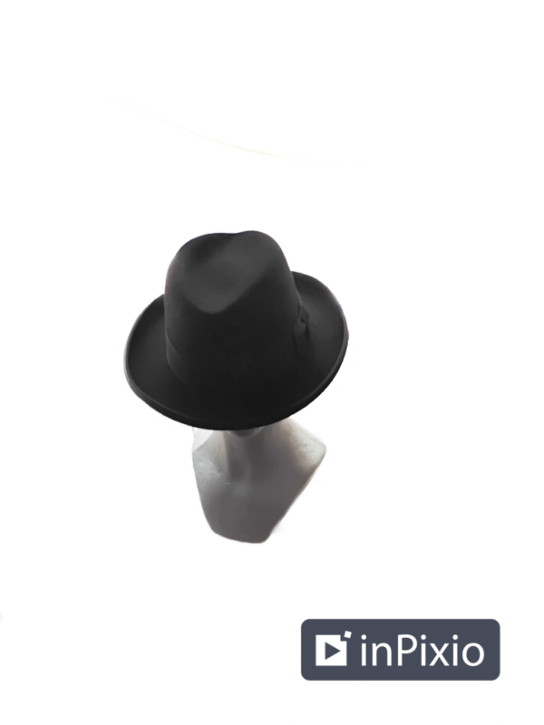 A mens wool fedora in black with a 2 inch black band. 2 1/2 inch brim with a 5 inch crown. Inside of hat is lined and says designer Collection. The beige lining has a pinkish stain on it and it could be from a marker. (see picture)