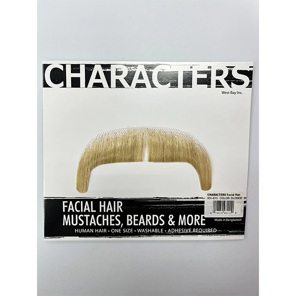 A mustache in blonde only. A good 1800’s or cowboy mustache. The mustache is 100% human hair and are designed for theatrical use or costuming and is hand-tied on a lace backing. An adhesive such as spirit gum is used to attach the mustache to your upper lip. Spirit gum is available on our website.