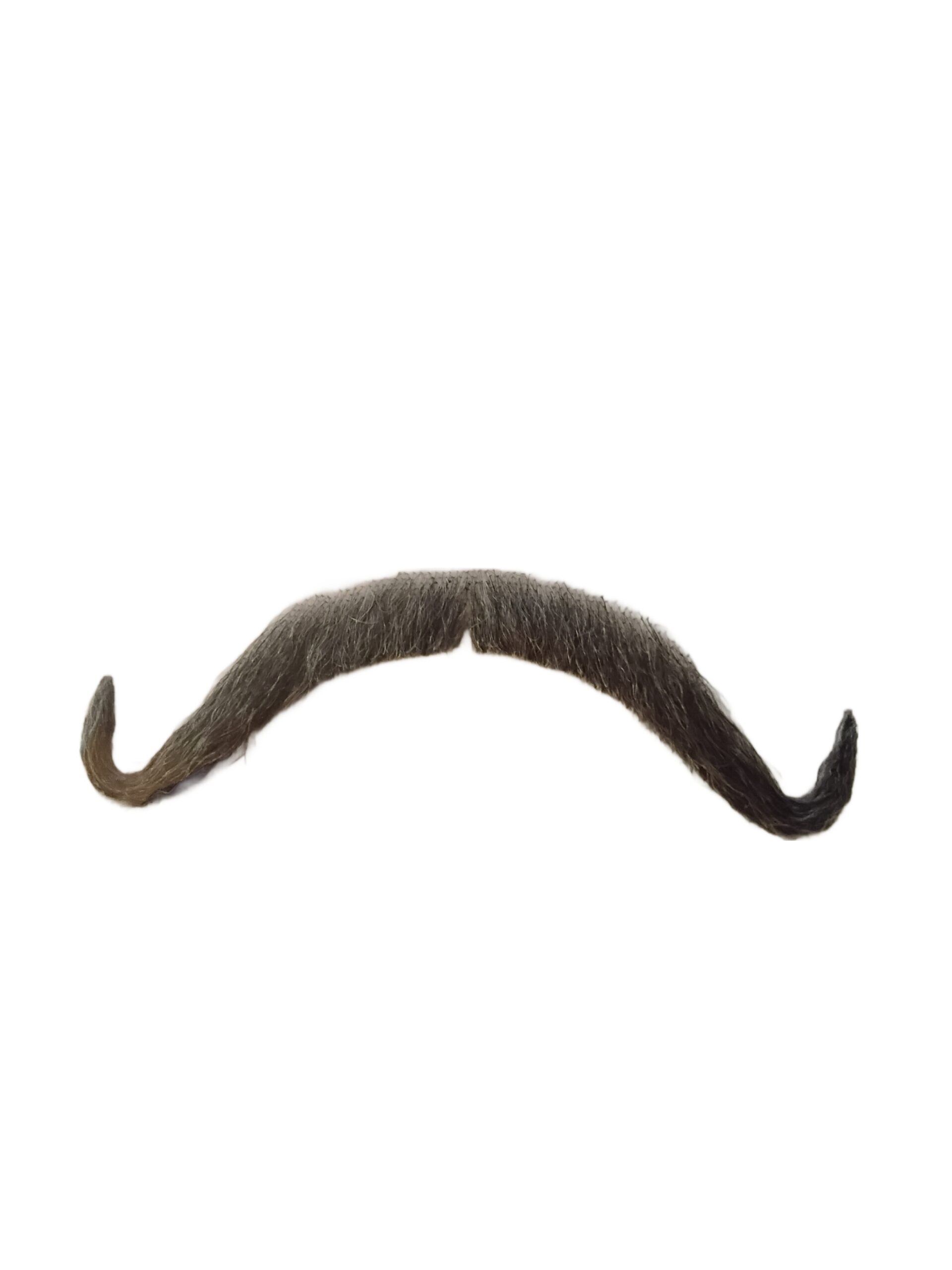 100% human hair handlebar moustache. Comes in Salt and Pepper Grey and Blonde