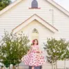 The Nicolette dress is a 100% cotton summer dress featuring a pattern of clustered pink roses on a cream background. It has a flattering …