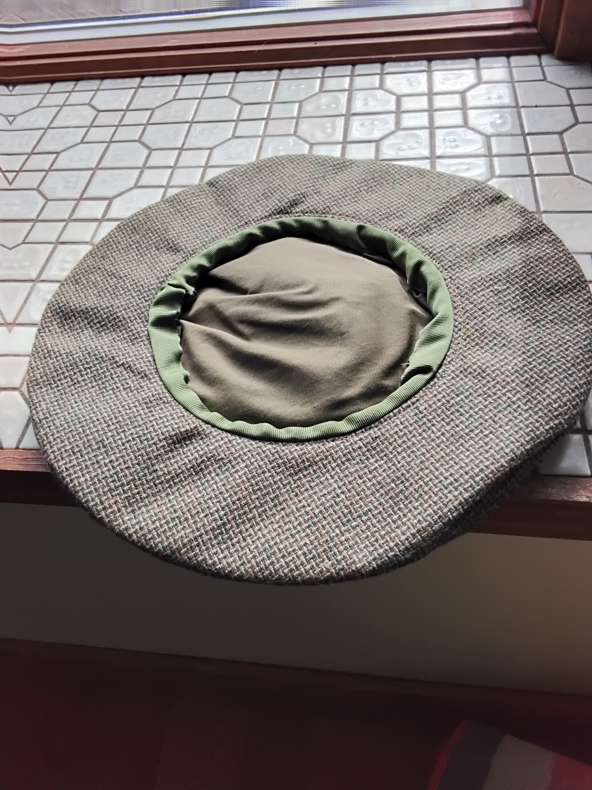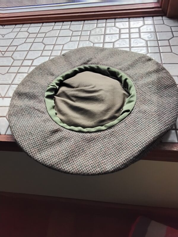 The hat is made of tweed fabric with colors of olive green, gold and brown. An ostrich feather would be a great addition to this hat.