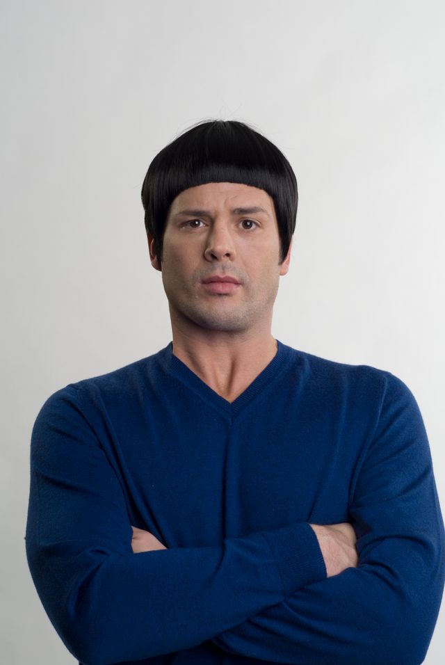 Spaceman wig in the color black features a sleek, straight bowl-cut or bob hairstyle with straight bangs and a rounded shape. The wig is a sci-fi inspired look like Spock from Star Trek or a 60s-70s character of this era.