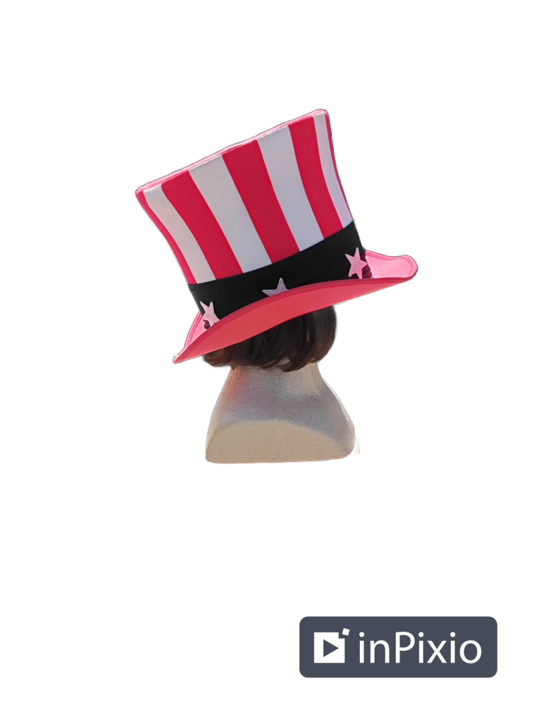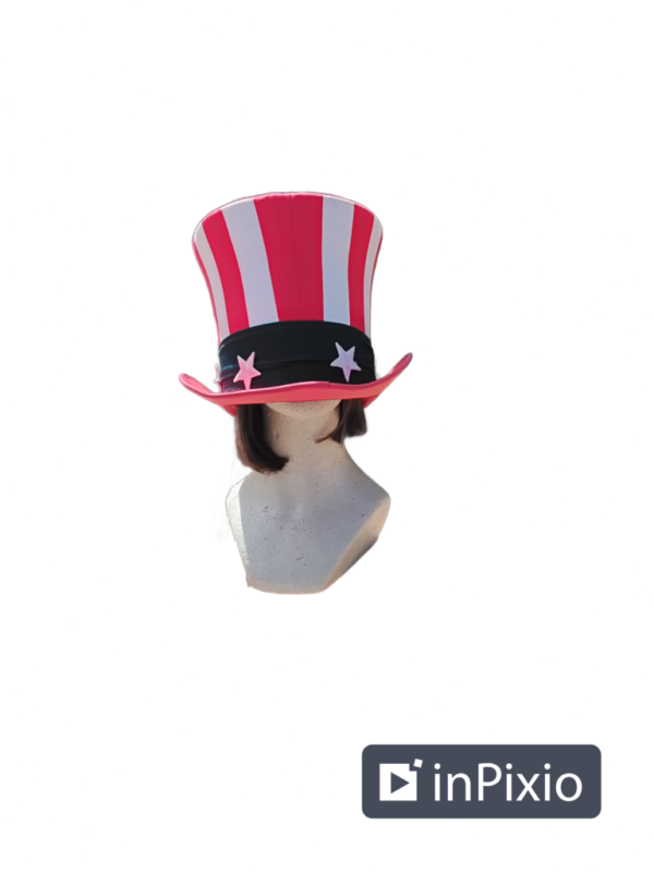 Uncle Sam Top Hat Rental is a fantastic hat. It is available in Large or Xlarge. The crown of the hat is 8″ and the rim is 2″. The blue hat band with star appliques is 3″ wide. The hat is made a bit larger in circumference so a wig can be worn if you choose.