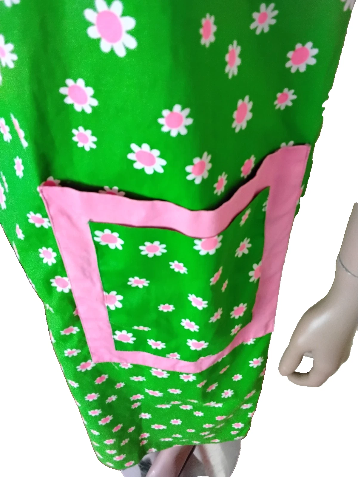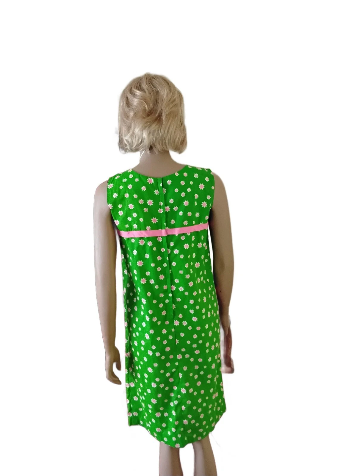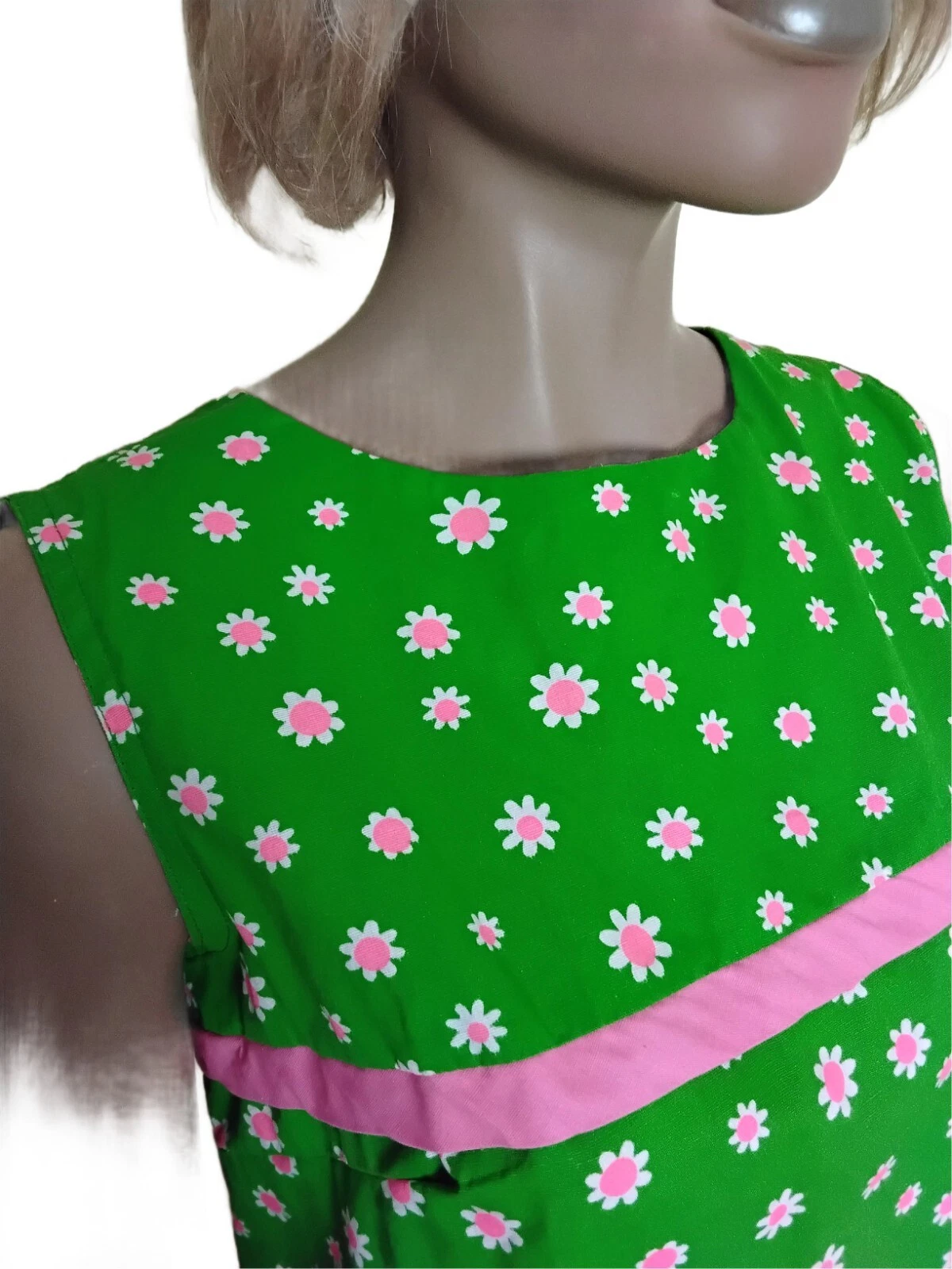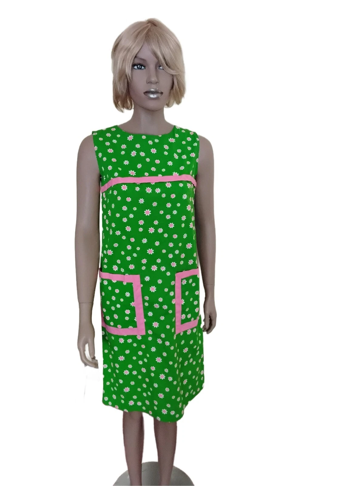 This 60s vintage dress has a simple, straight cut that hangs loosely from the shoulders without a defined waistline. Shift dresses feature clean lines and minimal embellishments. The cotton blend fabric has a solid lime green background with pretty white like daisies with a bright pink middle. The dress is also trimmed in that same bright pink underneath the bust and around the nice size pockets. This dress is so darn cute and a nice size of 12. (remember it is a vintage 12, see the measurements. It has a zipper closure and is sleeveless. Such a fun dress for summer!