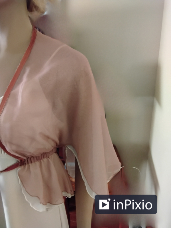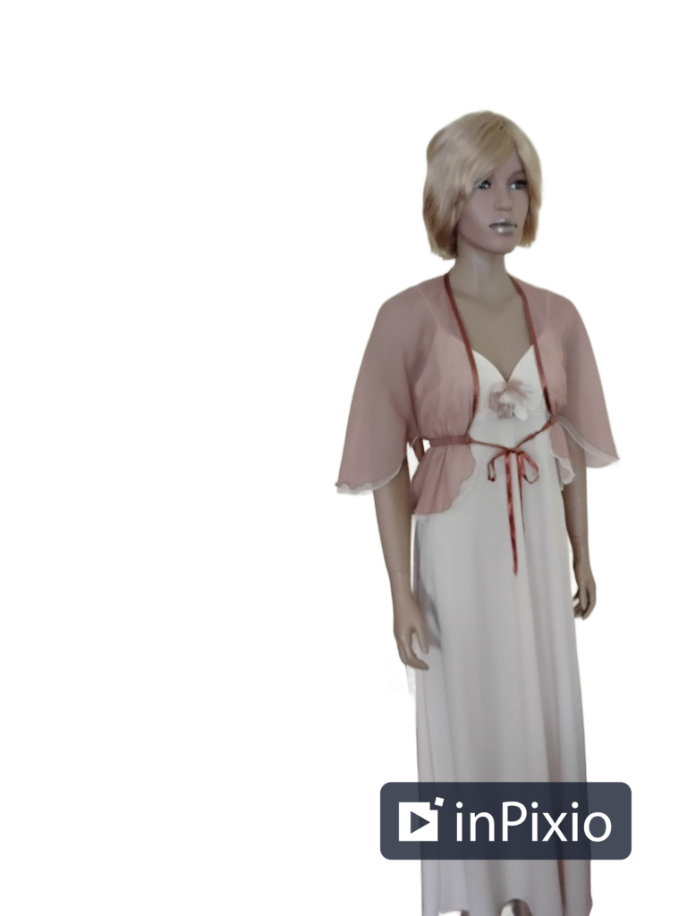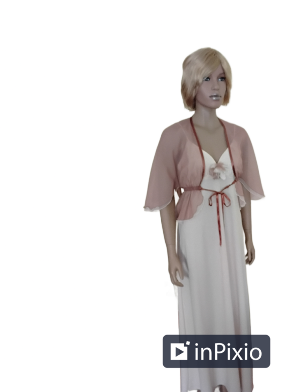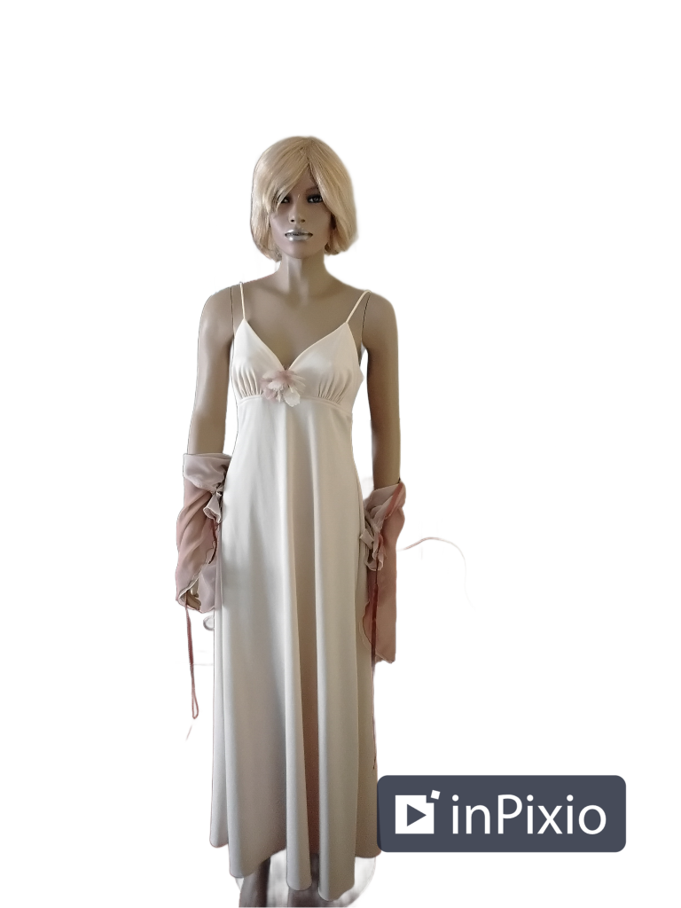 This long beige dress is a vintage from the 70s or possibly early 80s. The style of the dress made of a polyester material, with its spaghetti straps, empire waist and flowing skirt was popular during this time. The color was also popular back then. The same fabric from the kimono style top was used to make the attached flower shown on the dress. The flower reminds of feather in a way.