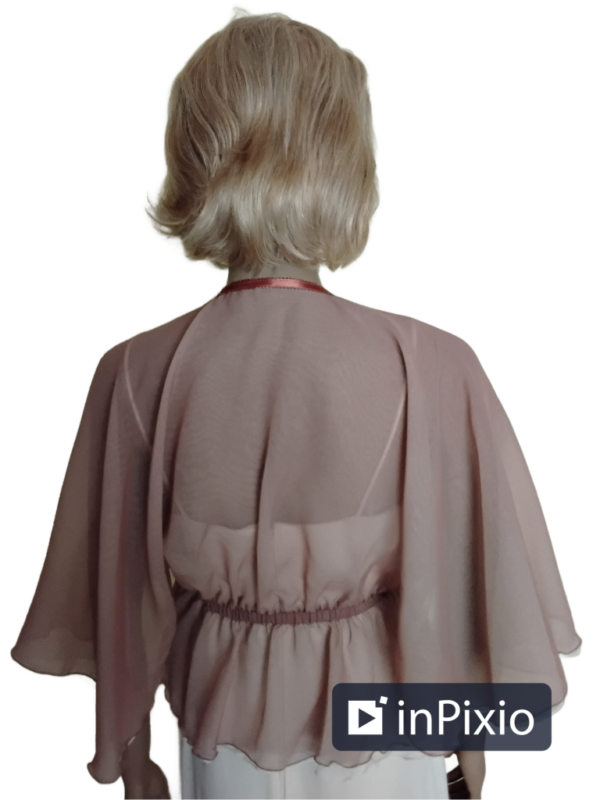 The dress has a zipper in the back for closure. The top or cover up is a shear material with two tone browns to match the dress. It ties with a ribbon.