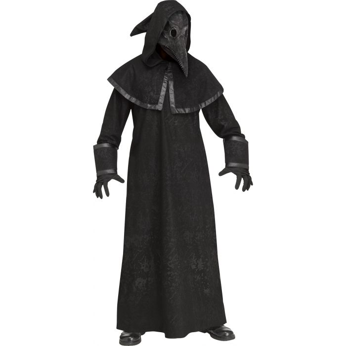 Complete costume features full-length distressed look robe with long sleeves and cuff finish, matching hood with capelet and faux leather trim, black poly gloves, and fearsome plague doctor half mask with back of head elastic.