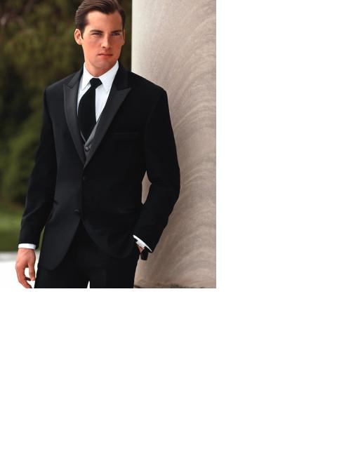 A modern fit black tuxedo with a 2 button closure. A satin peak lapel, side vents and a flat front trouser.