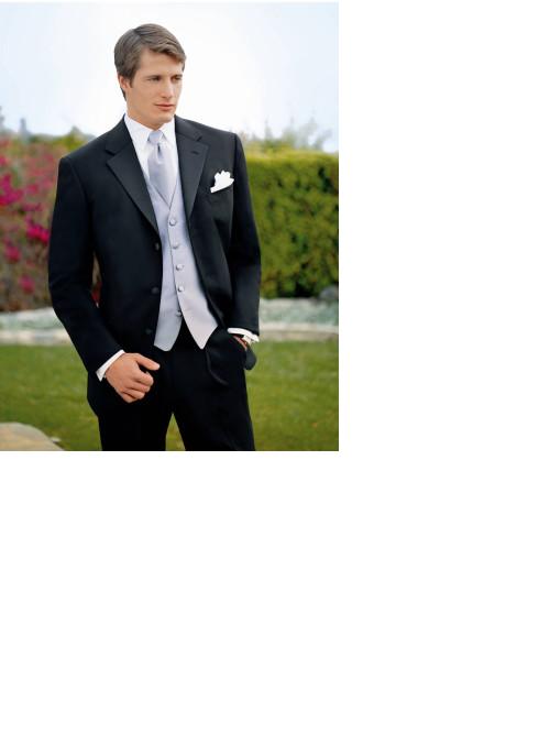 A Ralph Lauren black 3 button closure, satin peak lapel and pleated front trousers. Tie, shirt, vest and shoes are included in the rental. We have a large variety of colors and styles for vests, ties and bow ties to choose from.