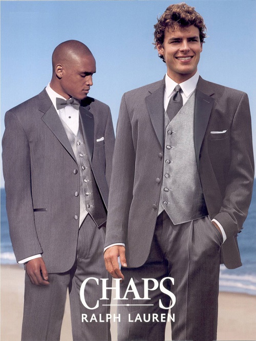 A 3 button closure tuxedo by Chaps Ralph Lauren in the color Steel Gray with a satin notch lapel.