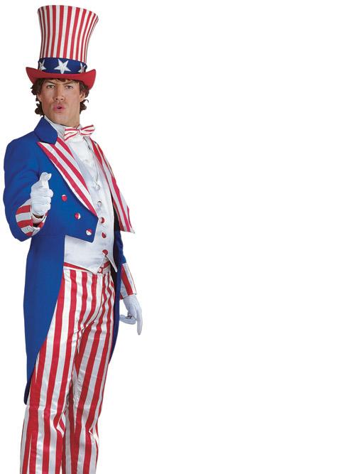 Uncle Sam rental will include: Blue gabardine jacket with red and white satin lapels, cuffs and buttons. White satin vest front and red and white satin pants, top hat, gloves and patriotic bow tie
