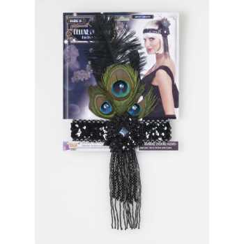Flapper headpiece in a black sequin headband with a peacock feather and beaded applique