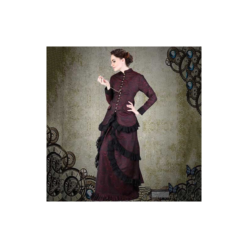 An aristocratic ensemble, made using fine brocade fabric and black net lining. Beautiful lace adorns the hem while the button down front and slim sleeves add to the elegance of the blouse. Broad lace trim finishes every layer of the long skirt.