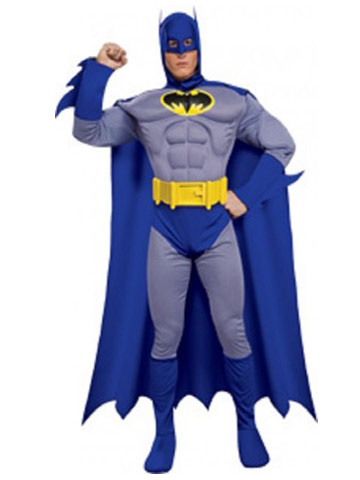 Muscle chest jumpsuit with attached boot tops, headpiece with cape and belt