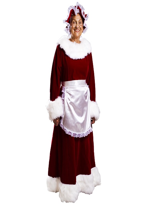 Mrs Clause rental will include a velvet dress with plush fur, Apron, velvet mop hat and Mrs Claus wig and glasses. Sizes start at 8-10 but if you are smaller, the apron helps take in the waist for a smaller size.